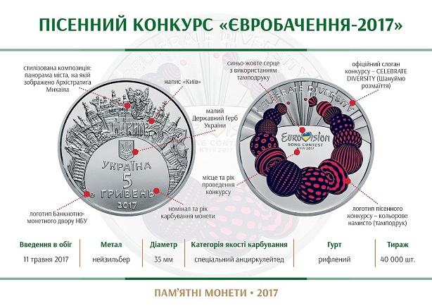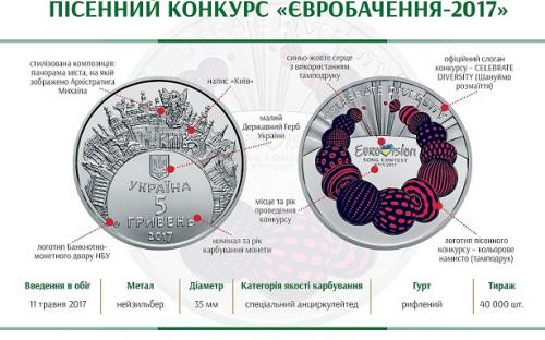 Национальный банк Украины 11 мая 2017 года введет в обращение памятную монету, посвященную проведению 62-го песенного конкурса «Евровидение-2017» в Украине.