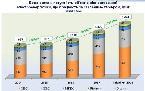 Загалом, з початку 2015 р. по кінець ІІ кварталу 2018 р. введено в експлуатацію 677 МВт потужностей відновлюваної електроенергетики, у встановлення яких інвестовано понад 650 млн євро. Зокрема, за «зеленим» тарифом введено: