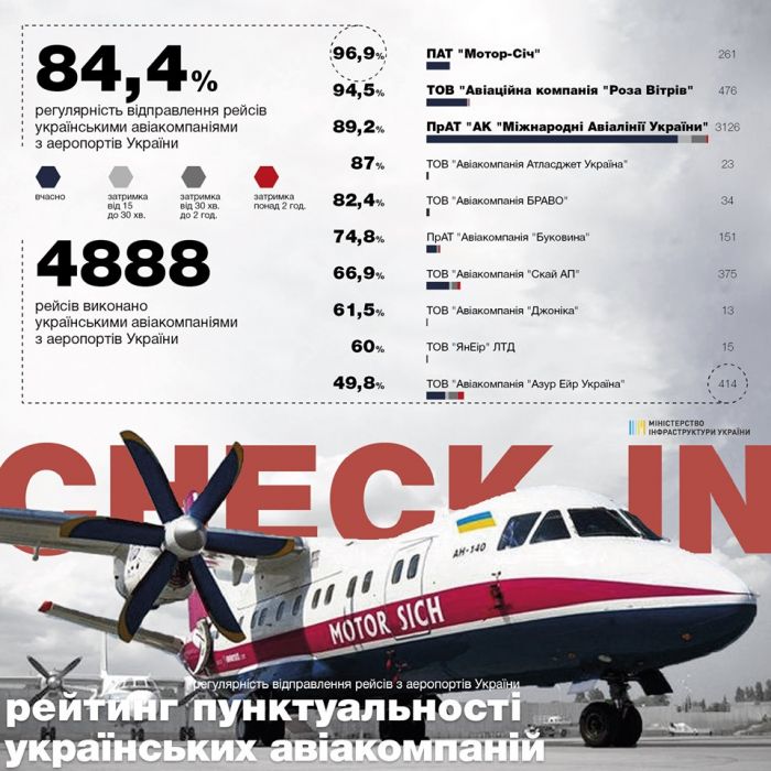 Как сообщалось, в апреле МИУ вновь назвало наиболее пунктуальной авиакомпанией "Мотор Сич". В апрельском рейтинге пунктуальности украинских авиакомпаний в первой тройке оказались "Мотор Сич", Windrose и Yanair.