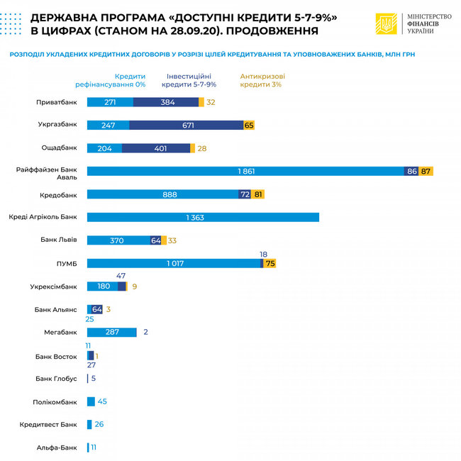 Уполномоченными в рамках программы "Доступные кредиты 5-7-9%" являются 18 банков: "Укргазбанк", "Ощадбанк", "Приватбанк", "Укрэксимбанк", банк "Львов", ПУМБ, "Кредобанк", "Альфа-Банк", банк "Альянс", "ТАСкомбанк", банк "Восток", "Поликомбанк", "Мегабанк", "Райффайзен банк Аваль", банк "Глобус", "Креди Агриколь Банк", а также "ОТП Банк" и "Кредитвест Банк".