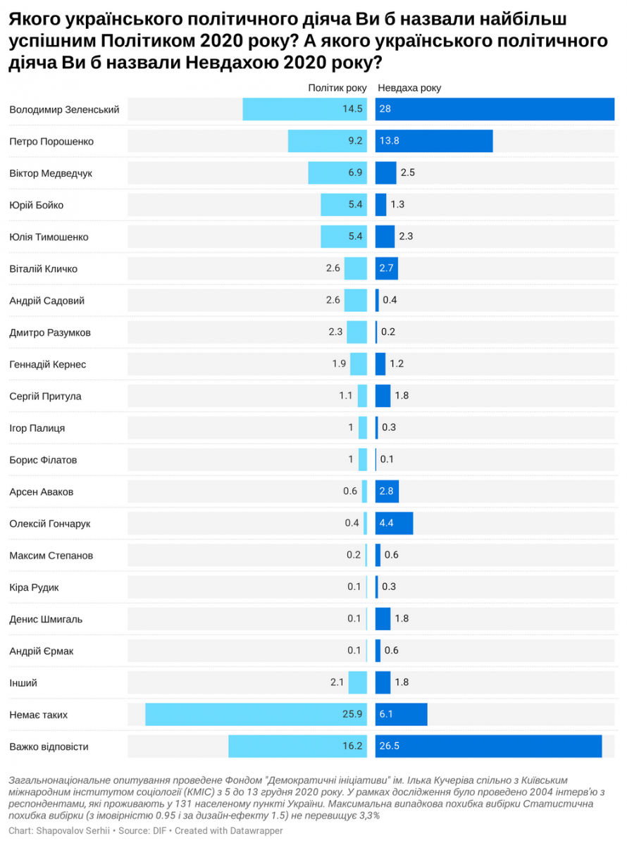 13,8% опрошенных думают, что победить в этой "номинации" должен был Порошенко, 4,4% – бывший премьер-министр Украины Алексей Гончарук, 2,8% – глава МВД Арсен Аваков, 2,7% – мэр Киева Виталий Кличко, 2,5% – Медведчук, 2,3% – Тимошенко.