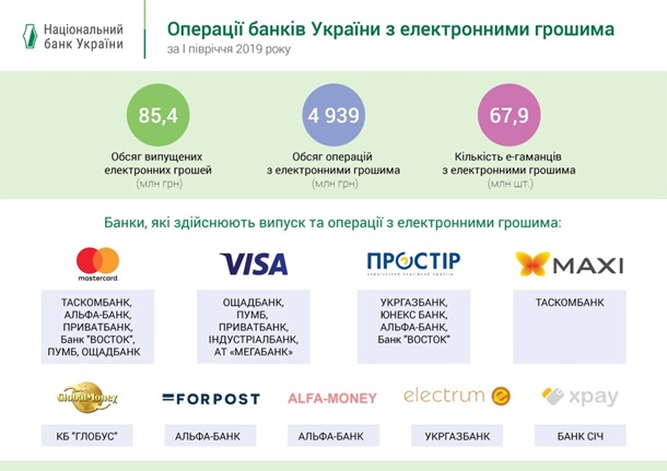 "В Украине наблюдается стабильный положительный тренд использования электронных денег. Так, в первом полугодии 2019 по сравнению с аналогичным периодом прошлого года произошло существенное увеличение: объемов выпущенных электронных денег - до 85,4 млн грн (более чем вдвое), объемов операций с электронными деньгами - до 4,9 млрд грн (больше на 60%), количества электронных кошельков -до 67,9 млн шт (больше на 20%) ", - сказано в сообщении НБУ.