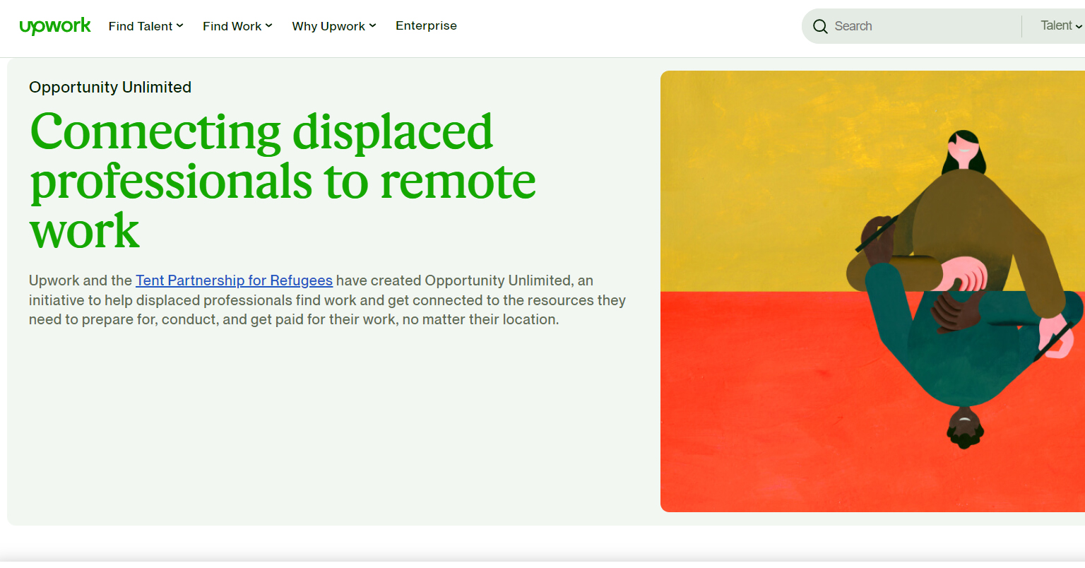 Ініціатива називається «Необмежені можливості: забезпечення переміщених фахівців віддаленою роботою» – https://www.upwork.com/opportunity-unlimited. Реалізовують її маркетплейс з пошуку роботи Upwork, некомерційна організація Tent Partnership for Refugees (Tent; об’єднує в мережу понад 250 великих компаній для залучення біженців), а також партнери – компанії Genpact (послуги у сфері цифрового управління бізнесом), Sutherland (цифрова трансформація бізнес-процесів), платіжна платформа Payoneer та інші.