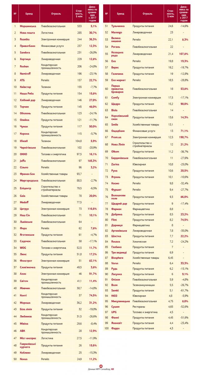 Лидером рейтинга, как и в прошлом году, стала компания «Моршинська» — стоимость ее бренда оценивают в $533 млн. Второе место заняла «Нова Пошта» ($285 млн), а третья — Rozetka ($244 млн). По сравнению с 2017 годом стоимость бренда обеих компаний выросла более чем на 30%.