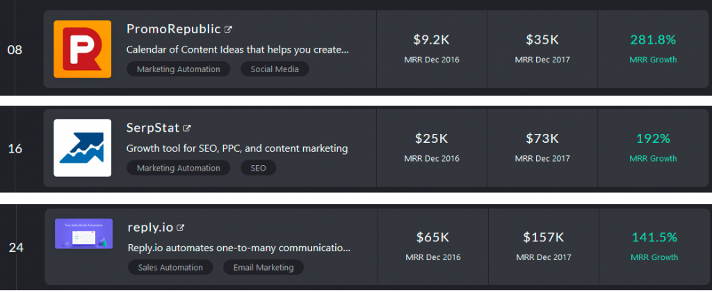 Украинские стартапы PromoRepublic, Serpstat и Reply.io вошли в топ-25 самых быстрорастущих сервисов в LATKA100. Если верить данным Латки, PromoRepublic вырос почти на 300% в 2017 году, сгенерировав $35 000 регулярного месячного дохода (Monthly Recurring Revenue или MRR). Serpstat показал рост почти на 200% с $73 000 MRR, а Reply.io вырос менее чем на 150%, но у него самый большой MRR — $157 000 в декабре 2017 года.