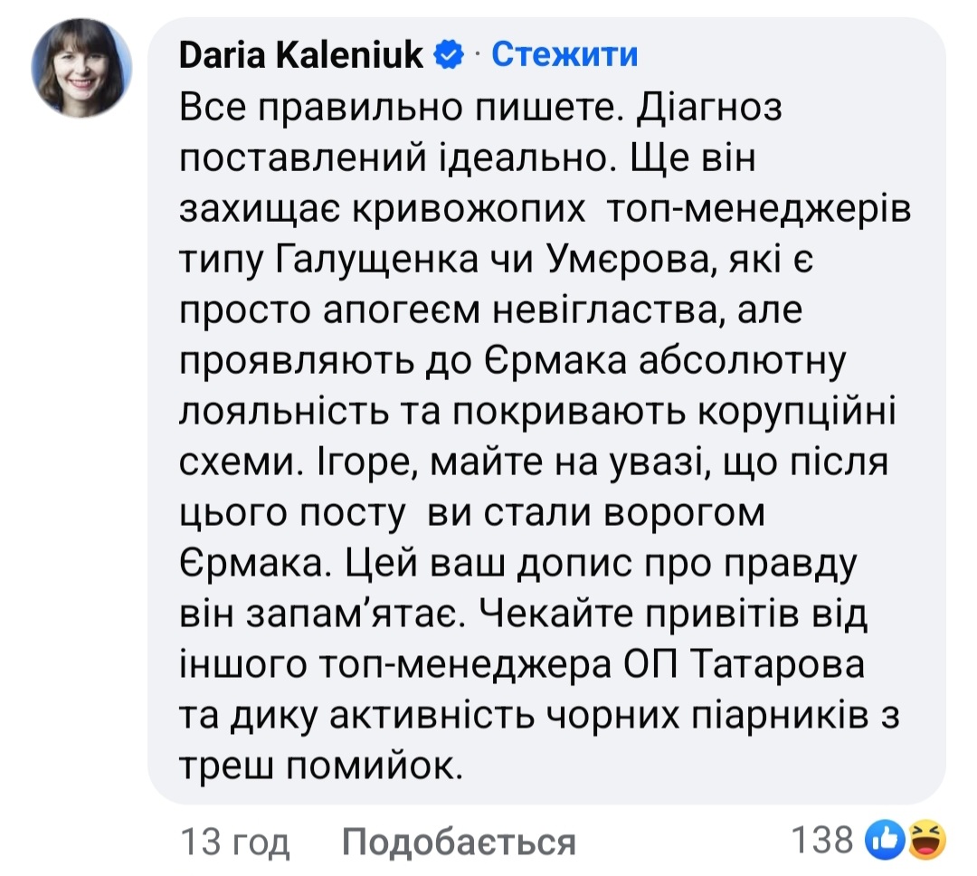 “Все правильно пишете. Діагноз поставлений ідеально. Ще він захищає кривожопих топ-менеджерів типу Галущенка чи Умєрова, які є просто апогеєм невігластва, але проявляють до Єрмака абсолютну лояльність та покривають корупційні схеми. Ігоре, майте на увазі, що після цього посту ви стали ворогом Єрмака. Цей ваш допис про правду він запамʼятає. Чекайте привітів від іншого топ-менеджера ОП Татарова та дику активність чорних піарників з треш помийок”, - пише антикорупціонерка Дар’я Каленюк.