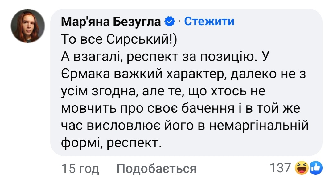 “То все Сирський!) А взагалі, респект за позицію. У Єрмака важкий характер, далеко не з усім згодна, але те, що хтось не мовчить про своє бачення і в той же час висловлює його в немаргінальній формі, респект”, - прокоментувала народна депутатка Мар’яна Безугла. Її, до речі, називали “торпедою Банкової”, бо Безугла активно критикувала спершу головкома Валерія Залужного (що призвело до його відставки), а потім і його наступника Олександра Сирського. Та й загалом, Безуглій дозволяють публічно критикувати військове командування у спосіб, на який не зважуються професійні і досвідчені держслужбовці. Через відсутність у Безуглої бюрократичних і етичних кордонів її, власне, і пов’язували з головою ОП.