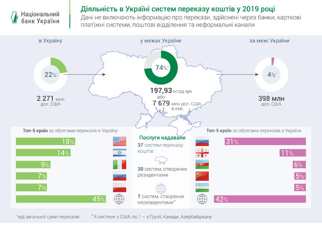 Кроме того, по данным НБУ, через системы перевода поступила пятая часть всех частных переводов в Украину. Так, в Украину за 2019 год перечислили $2,27 млрд в эквиваленте (21,94% от общей суммы переводов), за пределы Украины – $398 млн (3,85% от общей суммы переводов).