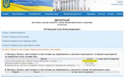 Народный депутат Украины от "Народного фронта" Игорь Котвицкий дополнил свою декларацию за предыдущий год, добавив в ней информацию о том, что на его счетах в банках - 970 920 000 гривен.
