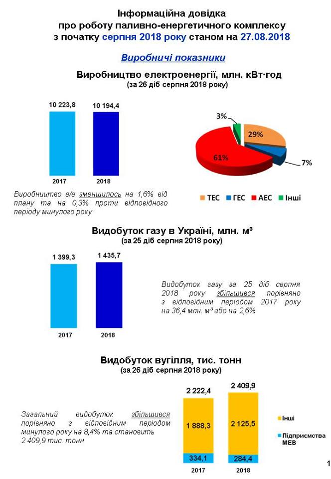 Также отмечается, что общая добыча угля за 26 дней августа увеличилась по сравнению с соответствующим периодом 2017 года на 8,4% и составляет почти 2 410 тыс. тонн. Из них 284,4 тыс. тонн добыто на шахтах, принадлежащих к сфере управления отраслевого министерства.