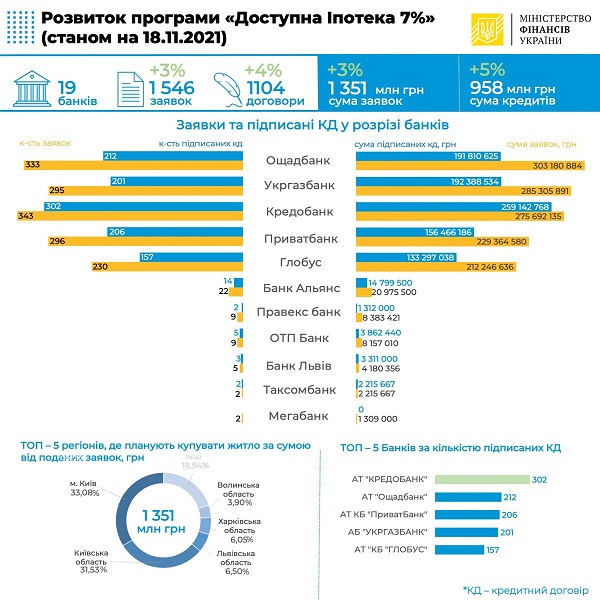 В рамках госпрограммы «Доступная ипотека 7%» уполномоченные банки по состоянию на 18 ноября выдали 1104 кредита на общую сумму 958,6 млн грн, сообщает пресс-служба Минфина.