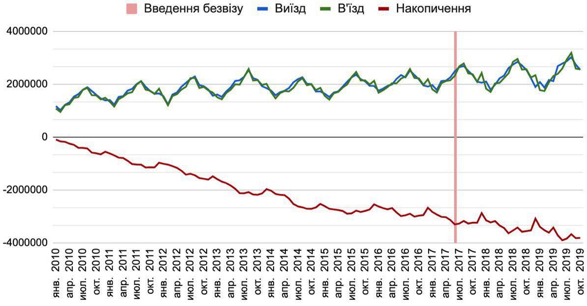 Дубилет утверждает, что введение безвизового режима с ЕС существенно не повлияло на итоговые показатели миграции: "Я это объясняю тем, что произошло перераспределение: люди стали меньше ездить в РФ (по крайней мере, официально) и больше - в Европу".