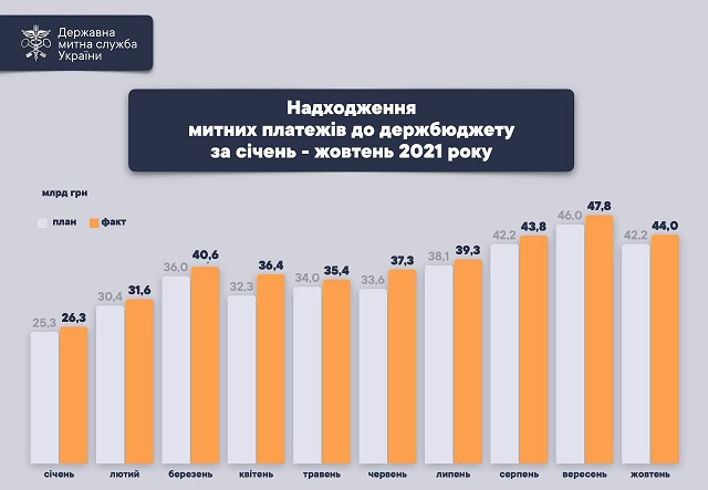 В октябре Государственная таможенная служба перевыполнила план поступлений на 4,3% и перечислила в бюджет 44 млрд гривен.