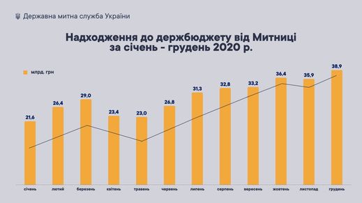 В декабре Государственная таможенная служба Украины выполнила план поступлений на 125% и перечислила в госбюджет 38,9 млрд грн при запланированном показателе в 31 млрд грн, сообщили в пресс-службе ведомства.