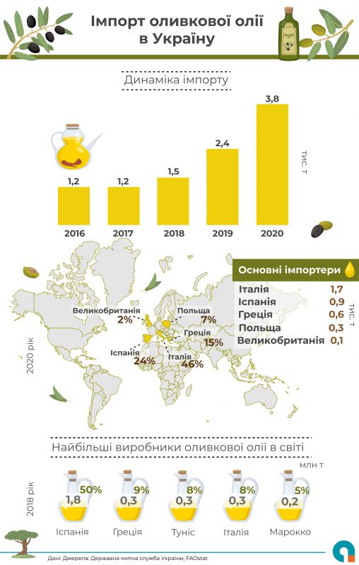 По данным УКАБ, в течение последних пяти лет импорт оливкового масла увеличился в три раза. Так, в 2016 году было импортировано 1,2 тыс. тонн продукта, в 2020 году – 3,8 тыс. тонн.