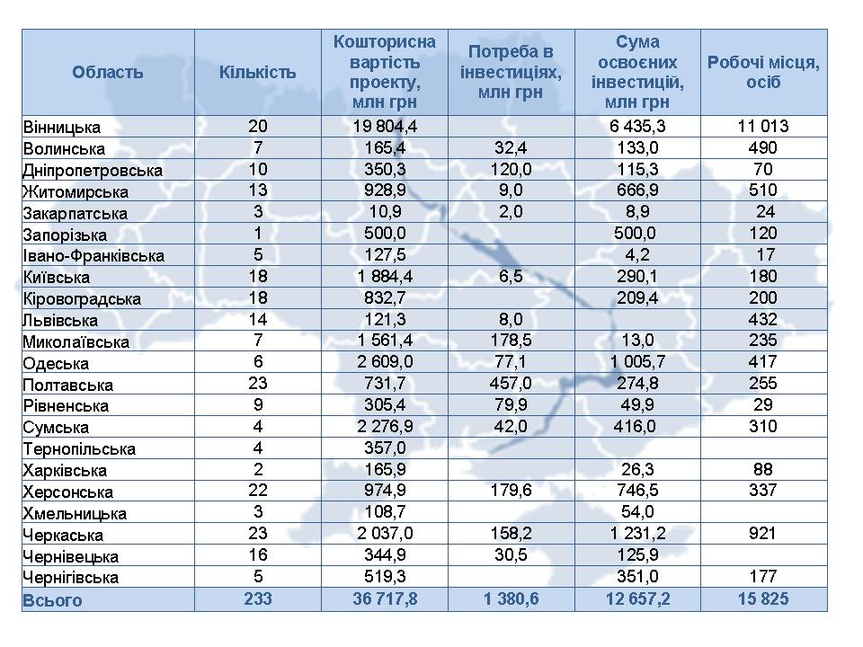 Наибольшее количество таких проектов внедряется в: Полтавской и Черкасской (по 23 единицы), Херсонской (22 ед.), Винницкой (20 ед.), Киевской и Кировоградской (по 18 ед.) областях.