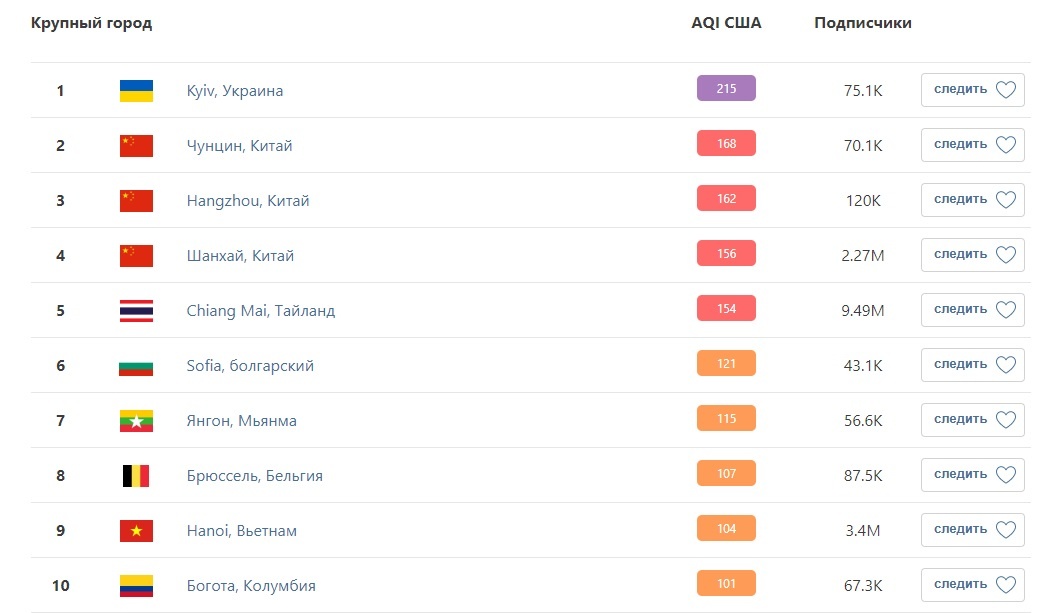 Киев является единственным городом в мире, где AQI превышает 200, еще в пяти (Чунцине, Ханчжоу, китайском Шанхае и таиландском Чиангмае) установлен "красный уровень", то есть AQI выше 150.