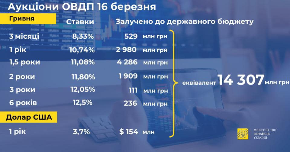 По итогам аукционов по размещению облигаций внутреннего госзайма 16 марта Минфин привлек в госбюджет 14,3 млрд грн.