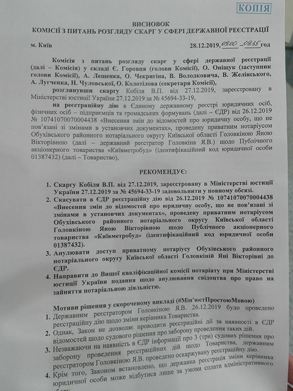 По информации замминистра юстиции Ольги Онищук, незаконная регистрация нового руководства была проведена частным нотариусом Яной Головкиной 26 декабря 2019 г. ПАО «Киевметробуд» 27 декабря подал жалобу на данное регистрационное действие нотариуса. Утром 28 декабря Комиссия по вопросам рассмотрения жалоб в сфере государственной регистрации приняла решение об аннулировании данного регистрационного действия.