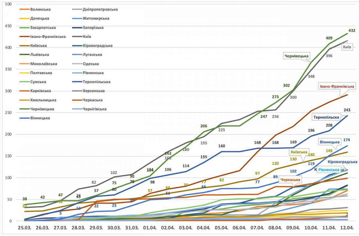 При этом наименьшая динамика распространения коронавируса фиксируется в Николаевской (2), Луганской (3) и Черниговской (9) областях.