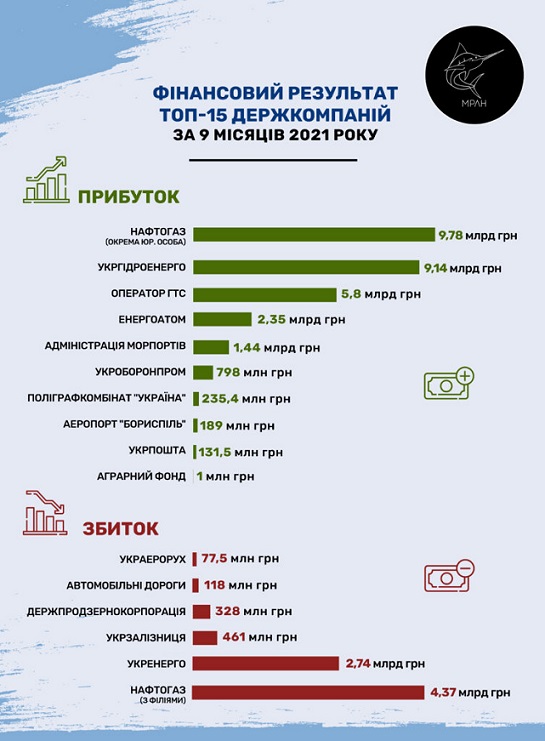 Серед збиткових підприємств опинились «Укренерго» із 2,74 млрд грн збитку, «Укрзалізниця» з 461 млн грн збитку, Держпродзернокорпорація – 328 млн грн збитку, Автомобільні дороги України – 118 млн грн збитків і «Украерорух» – 77,5 млн грн збитків.