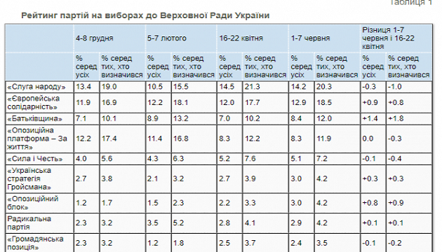 В частности, правящую партию "Слуга народа" поддержали бы 20,3% среди тех, кто собирается голосовать и определился со своим выбором, а оппозиционную "Европейскую солидарность" — 18,5% среди тех, кто определился с выбором.