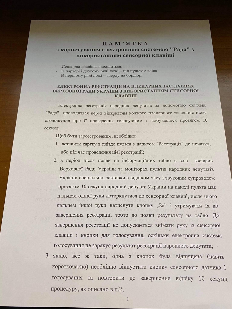 Отныне для срабатывания голосования депутатам придется прикладывать палец к сенсору под динамиком в левой части системы голосования «Рада» на своих рабочих местах.
