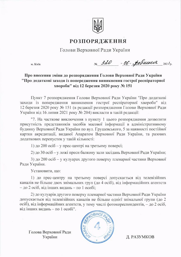 Верховная Рада расширила разрешенное количество представителей СМИ, которые могут работать в парламенте на втором и третьем этажах. Соответствующее распоряжение подписал глава ВР Дмитрий Разумков, сообщила пресс-секретарь главы ВР Ольга Туний.