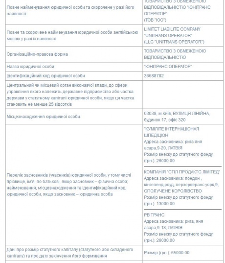 "Эта компания в 2015 году выиграла тендеры на 342 550 000 грн. "Объединенной горно-химической компании" на перевозки по железной дороге грузов "Иршанского горно-обогатительного комбината" и "Вольногорского горно-металлургического комбината". В госреестре указаны основатель "Юнитранс Оператора" - латвийские компании "Кумилите Интернационал Шпедицион" и "РО Транс", а также "Стол Продактс Лимитед" Соединенное королевство)", - отмечает СМИ.