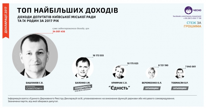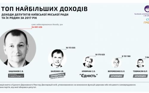 Больше всех заработал за прошлый год депутат Киевсовета от «Самопомощи» Сергей Башлаков. За год его доход составил 34 миллионов гривен.