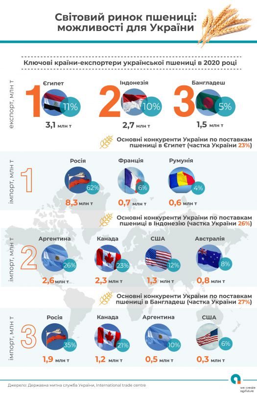 На рынке импортной пшеницы Египта лидерство удерживает Россия. Страна агрессор получила 62% объема закупленной культуры, второе место — Украина (23%), третье место — Франция (6%). Индонезия осуществляет наибольшую закупку пшеницы в Украине и Аргентины (по 26%), а также в Канаде (23%).