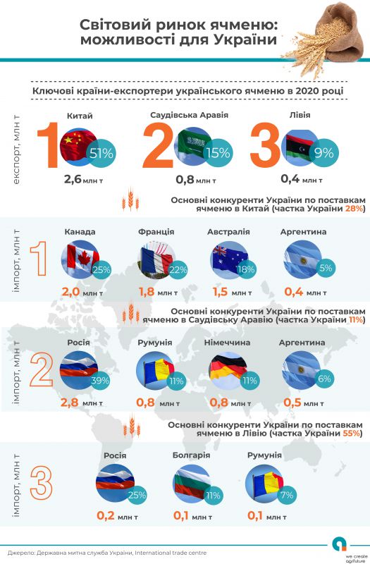 «В этом году Украина уже экспортировала 5 млн тонн ячменя, что на 22% превышает показатель прошлого года. Это наибольшие объемы экспорта за последние 10 лет. Основными странами-импортерами украинского ячменя являются Китай (51% украинского экспорта), Саудовская Аравия (15%) и Ливия (9%)», — прокомментировала Светлана Литвин, аналитик УКАБ.
