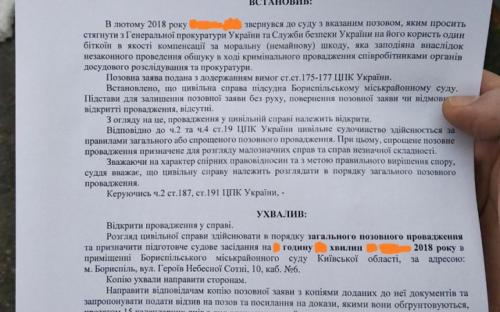Бориспольский горрайонный суд Киевской области в начале марта зарегистрировал не совсем обычное исковое заявление. Гражданин Украины подал иск против сотрудников СБУ и ГПУ, документ касается морального ущерба, который правоохранители нанесли истцу во время обысков.