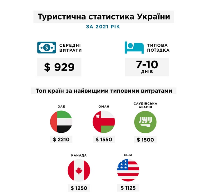 Найбільше витрачали в Україні громадяни ОАЕ – у середньому $2220 за період перебування. Громадяни Саудівської Аравії та Оману витрачали в середньому $1500, Канади – $1250, США – $1125. У середньому іноземці протягом семи – дев’яти днів перебування в Україні витрачали $929.