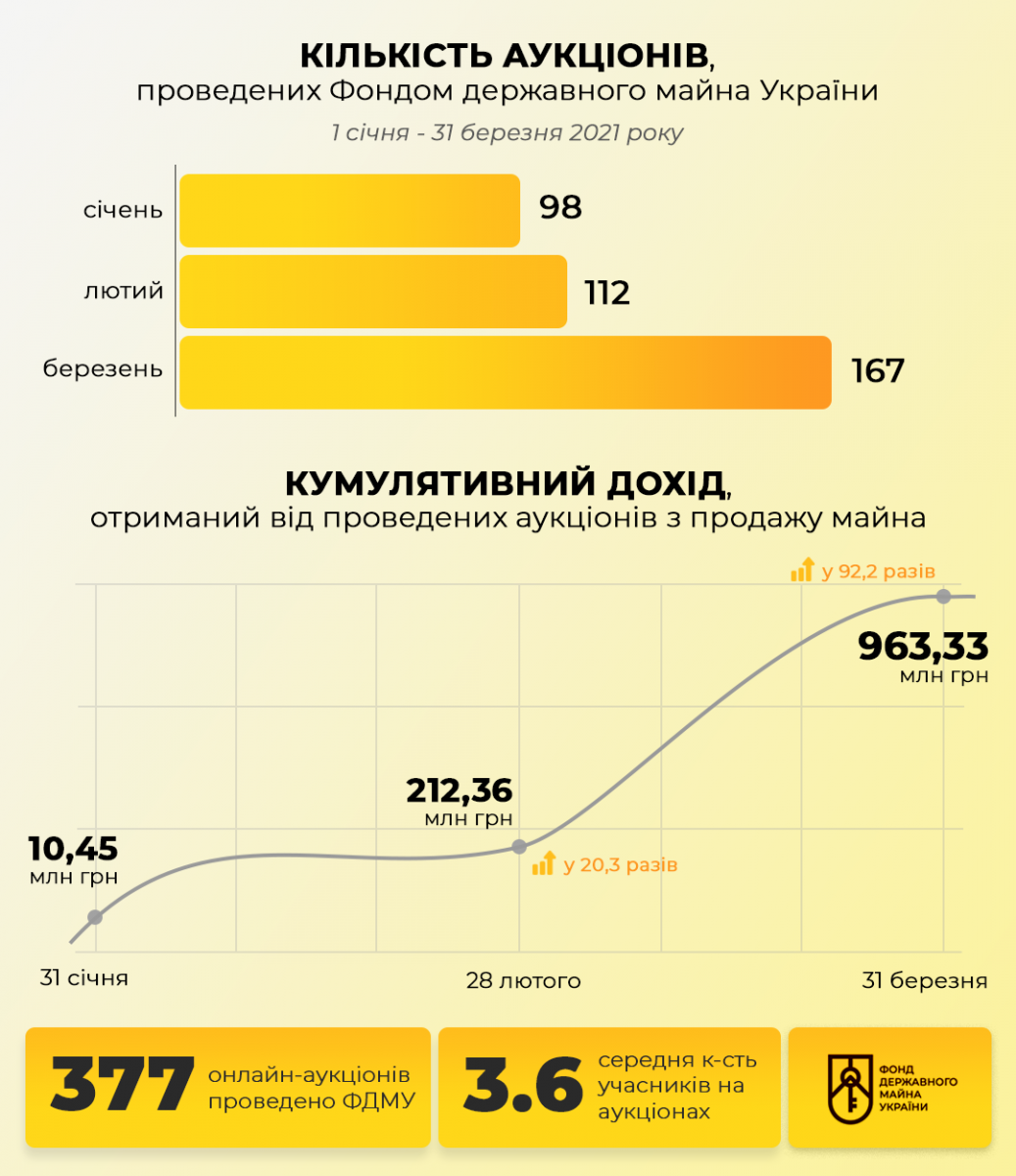 «На самом деле стоимость активов, аукционы по продаже которых проводились Фондом в течение января-марта, превышает 1 млрд грн, однако несколько победителей еще не подписали договоры о купле-продаже активов. Надеемся, это произойдет уже в ближайшее время», — отметили в пресс-службе.