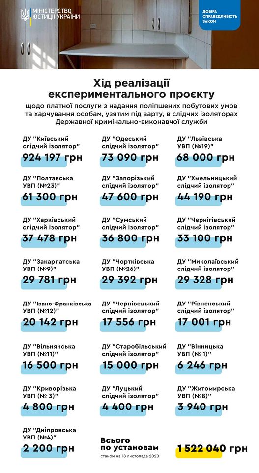 Как сообщалось ранее, по состоянию на 5 октября платные камеры в СИЗО принесли государственному бюджету первый миллион гривен, наибольшую сумму собрали в платных камерах Киевского СИЗО.