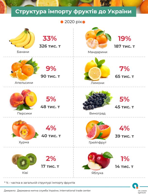 Кроме этого популярен такой фруктовый импорт: мандарины (187 тысячи тонн), апельсины (90 тысяч тонн), лимоны (65 тысяч тонн), а также персики (48 тысяч тонн).