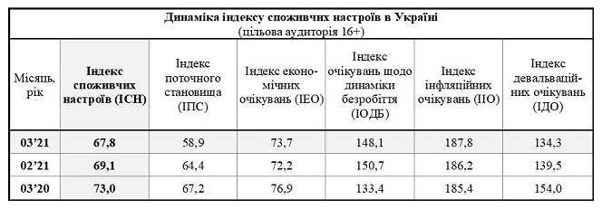Индекс потребительских настроений в Украине в марте 2021 году составил 67,8 п., что на 1,3 п. ниже, чем в феврале. Падение индикатора связано со снижением индекса целесообразности крупных покупок, свидетельствуют данные ежемесячного исследования компании Info Sapiens.