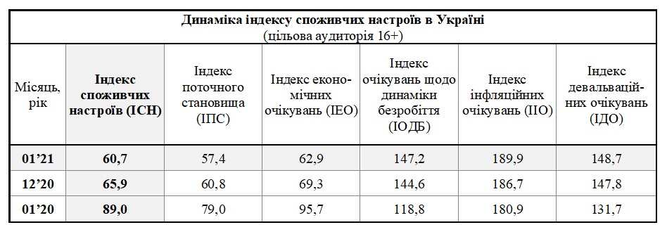Индекс потребительских настроений (ИПН) украинцев в январе упал на 5,2 пункта – до 60,7 пункта по 200-бальной шкале.