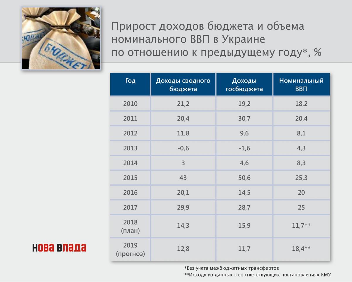 Прирост доходов сводного бюджета в 2019 г. формально планируется на более низком уровне, чем прирост номинального ВВП, что опять-таки формально выглядит неким послаблением для налогоплательщиков. Кабмин прогнозирует, что номинальный ВВП в 2019 г., по сравнению с 2018 г., вырастет на 18,4%. Тогда как рост доходов сводного бюджета на следующий год по плану должен составить 12,8%.
