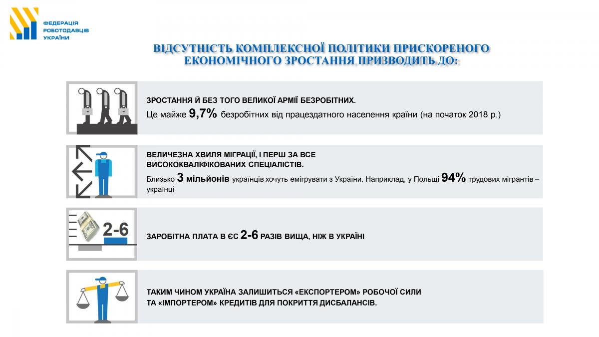 - Треба зробити так, аби люди не виїжджали з України, а навпаки приїжджали до нас. Для цього необхідно створювати високопродуктивні робочі місця, впроваджувати державний контроль на цінами і продуктами, які відштовхують людей з України, удосконалювати систему професійно-технічної освіти.