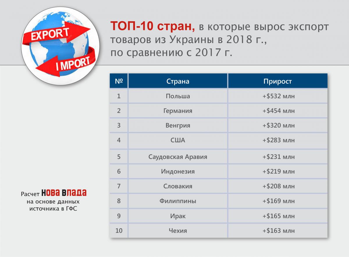 В целом десятка крупнейших стран-импортеров украинских товаров в 2018 г. осталась неизменной, в сравнении с 2017 г. Некоторые страны лишь поменялись местами в ТОП-10. См. ниже «ТОП-10 стран-импортеров украинских товаров в 2018 г., млн USD (доля в общем экспорте, %)».