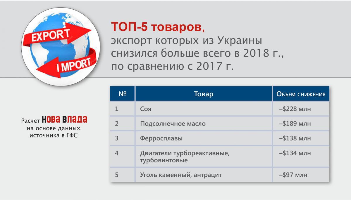 Ирония судьбы: в лидерах по снижению экспорта оказалась как раз сельхозпродукция и продукты ее переработки – соя и подсолнечное масло. См. ниже «ТОП-5 товаров, экспорт которых из Украины снизился больше всего в 2018 г., по сравнению с 2017 г.». Напомним, что подсолнечное масло занимает первую позицию в топ-10 по объемам поставок. Снижение связано с сокращением спроса со стороны ЕС, который частично переориентировался на американскую сою, а также – Египта и Китая, которые стали покупать больше подсолнечного масла у России.