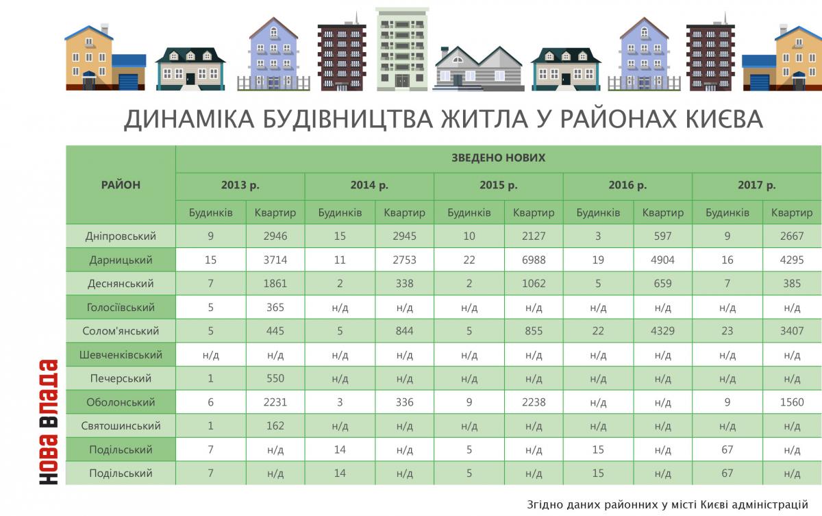 Показово, що навіть Київська міська держадміністрація (КМДА) не володіє повною інформацією про те, якими темпами забудовується місто. За даними шести районних адміністрацій столиці, протягом останніх п’яти років у Києві було побудовано більше 65 тис. квартир. Див. нижче «Динаміка будівництва житла у районах Києва».
