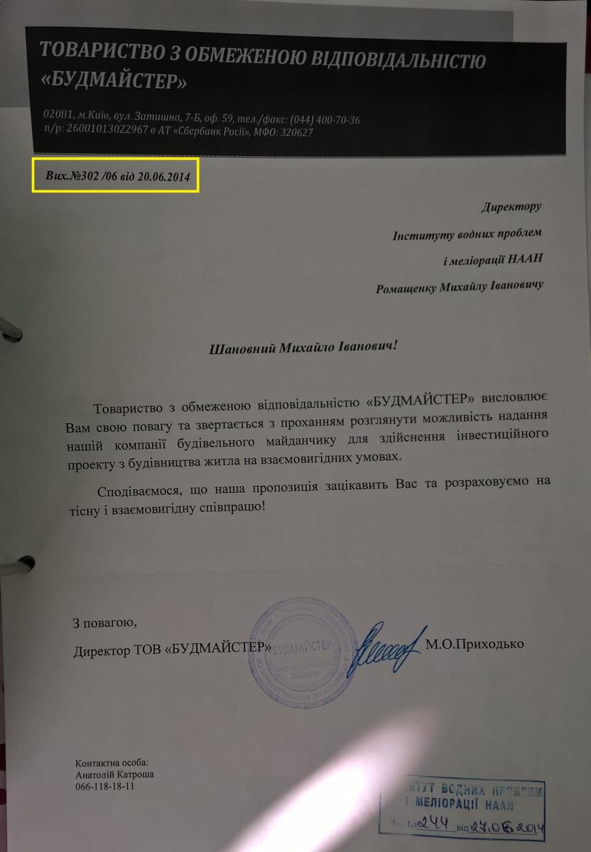 Юристи інституту підтвердили, що до 2016 р. інститут не вів перемовин про будівництво житла на території інституту і не звертався до керівного органу – Президії НААН – стосовно пропозицій інвесторів.