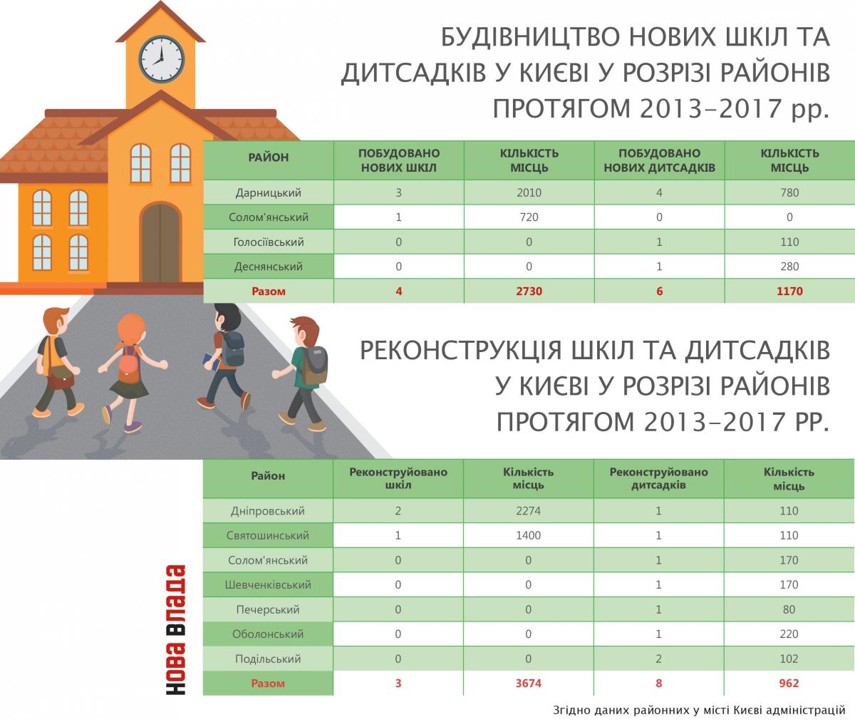Наведемо на прикладі будівництва шкіл та дитсадків. За даними КМДА, протягом останніх п’яти років у столиці було побудовано всього чотири нових школи на 2730 місць та шість дитячих садочків на 1170 місць. Також проведено реконструкцію у трьох щколах на 3674 місць та у восьми дитсадках на 962 місця. Див нижче дані: «Будівництво нових шкіл та дитсадків у Києві у розрізі районів протягом 2013-2017 рр.» та «Реконструкція шкіл та дитсадків у Києві у розрізі районів протягом 2013-2017 рр.».