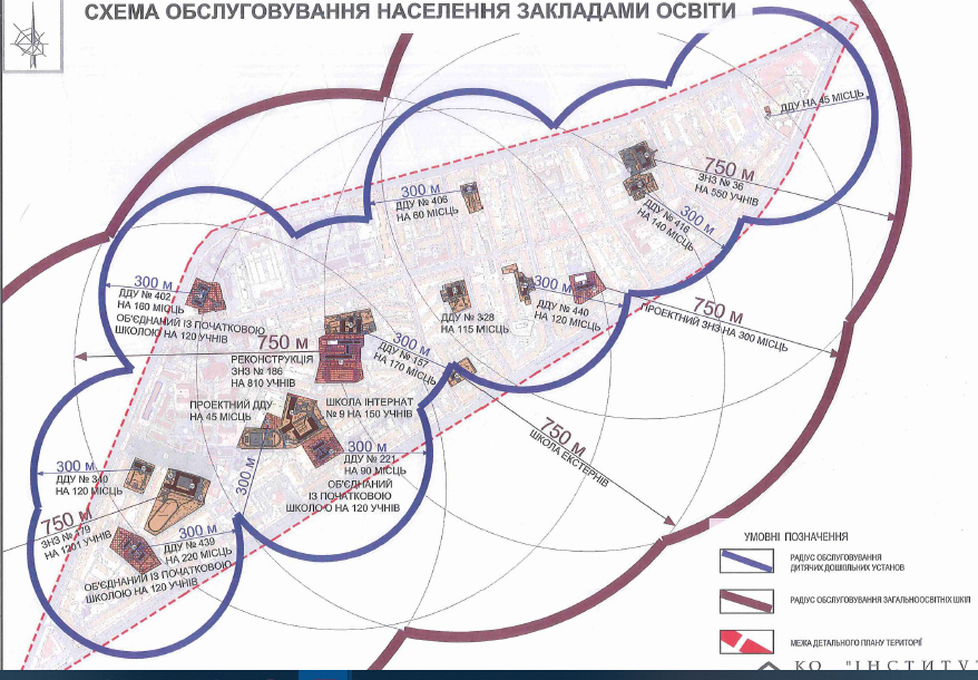 А от родинам із малолітніми дітьми запропонували ще затятіше боротися за вільні місця у дитсадочках. За даними КО «Інститут генплану м. Києва», зараз у межах Детального плану території є шість шкіл, і їх проектна потужність недостатня для нормативно необхідної кількості місць для існуючого населення: всього є 2771 місць, в той час як нормативно необхідна кількість – 3135 місць. Див. також нижче «Схему обслуговування населення закладами освіти в межах вулиці Васильківська та проспекту Голосіївського».