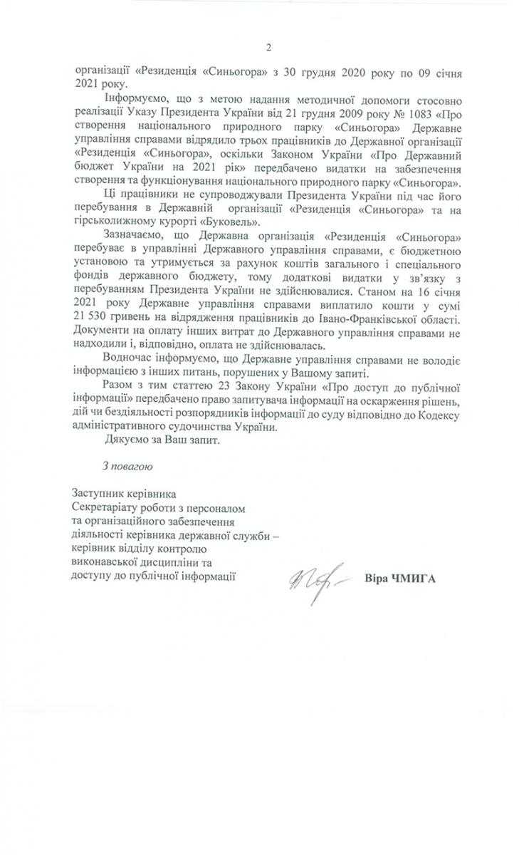 У листі ДУС сказано, що «Державна організація «Резиденція «Синьогора» перебуває в управлінні Державного управління справами, є бюджетною установою та утримується за рахунок коштів загального і спеціального фондів державного бюджету, тому додаткові видатки у зв’язку з перебуванням Президента України не здійснювалися».