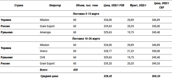 • НІБУЛОН — 60 тис. т за ціною 346,89 $/т C&F (326,00 $/т FOB, фрахт 20,89 $/т) з поставкою 16-26 березня;
