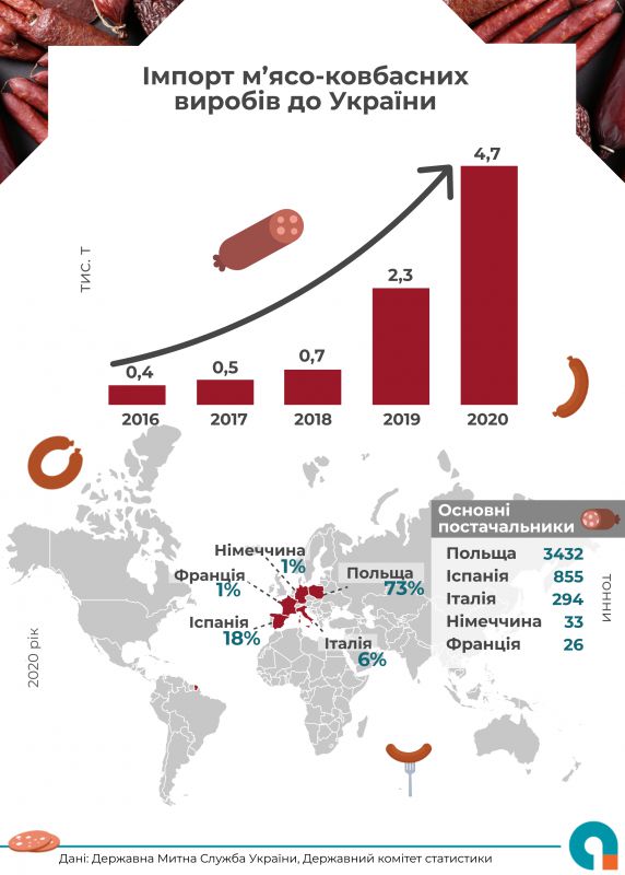 Импорт колбасно-мясных изделий в Украину в 2020 году составил 4,7 тыс. тонн, что в 12 раз превышает показатель пятилетней давности и в 2 раза больше по сравнению с предыдущим годом.
